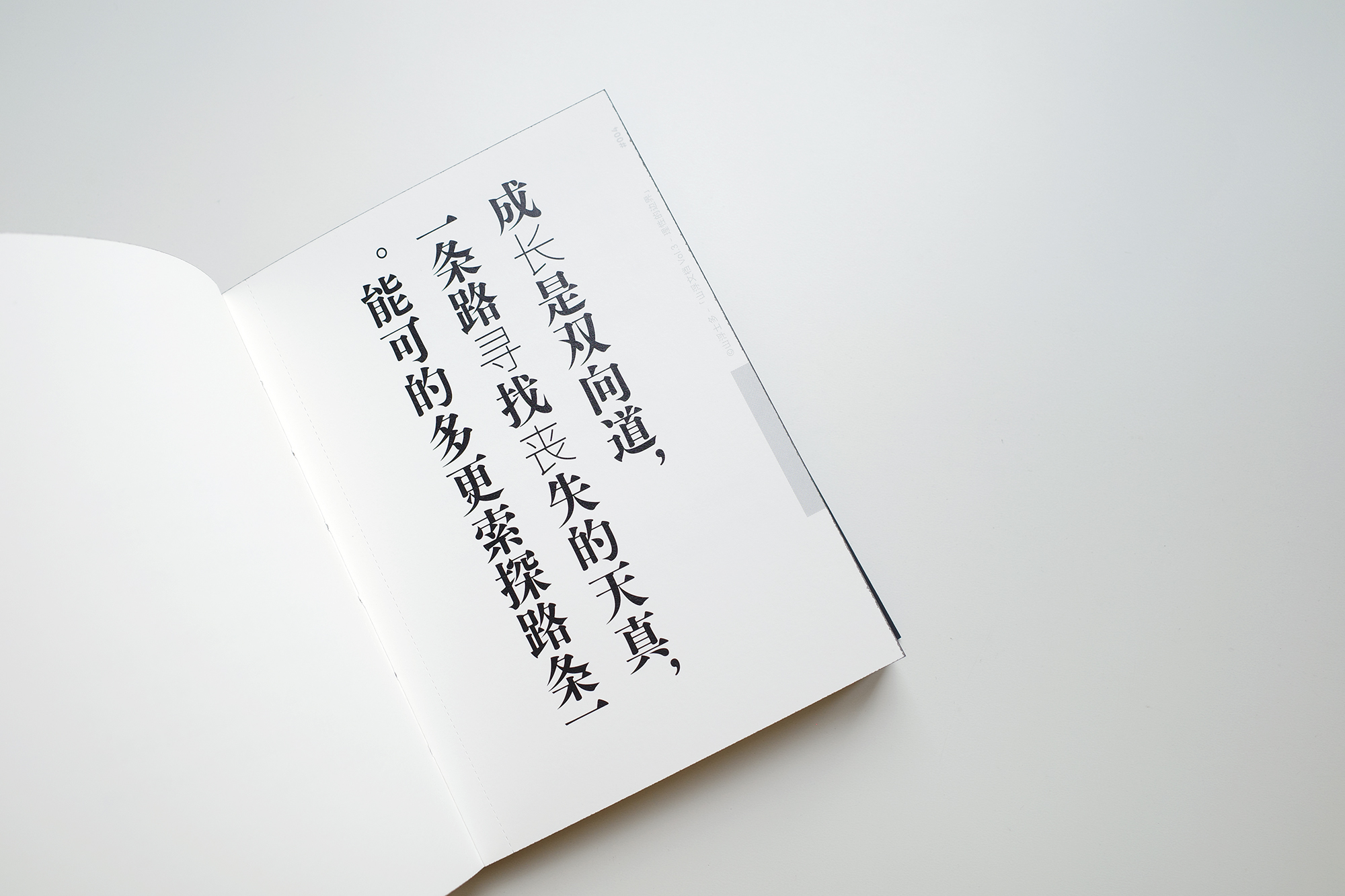 作品封面为270g亲肤手感纯黑艺术纸,三边刷黑;封面汉字与英文分别采用击凸与烫银工艺,在幽暗光线下,只能以触摸感受汉字轮廓,而调整观看角度,能清晰辨别出英文单词。作品结构为裸背线装,内文沿袭此作品系列的钢刀线设计,单张可完整撕下。